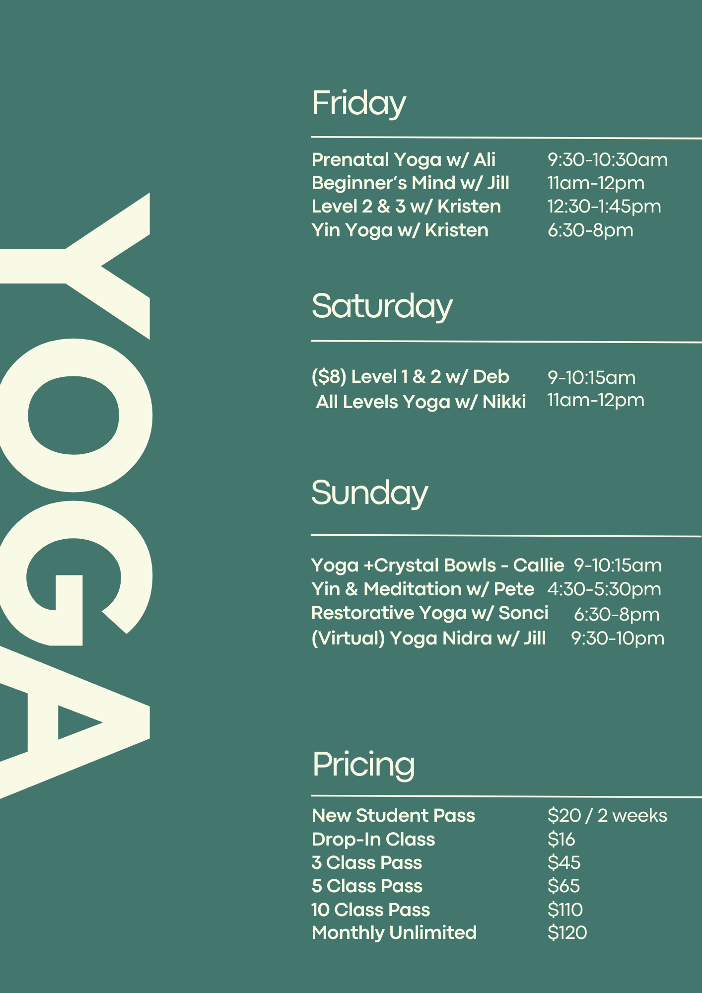 Below is a printable schedule just for you. Please double check our online calendar for most up to date information. If we close due to inclement weather, it will be noted there.
